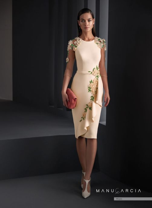 Apuesta por la elegancia con este vestido de corte a la rodilla y de falda entubada donde destaca un volante adornada con flores bordadas. El corte de la manga ranglan tres cuartos en tul nude también está adornada a modo de hombreras con aplicaciones al tono.