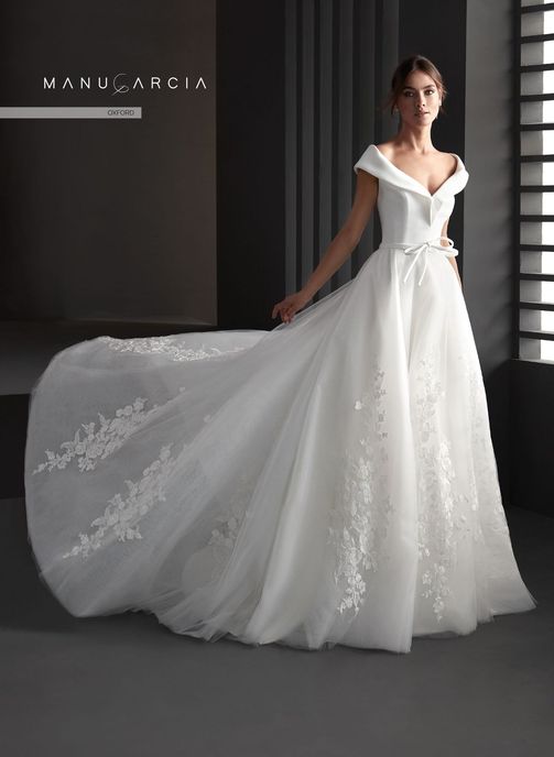 Vestido de novia estilo princesa en tul con multitud de detalles de encaje en la falda que le proporcionan una delicada apariencia romántica. Este refinado vestido te fascinara por su voluminosa falda y un cautivador cuerpo en crepe ceñido con escote vuelto.