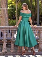 Glamuroso y juvenil vestido confeccionado en mikado, con una espectacular falda de vuelo y un cuerpo palabra de honor con un cuello vuelto extraíble que cae sobre los hombros, dejándolos al descubierto de una forma elegante. Este look se complementa con un cinto del mismo tejido que ciñe la cintura.