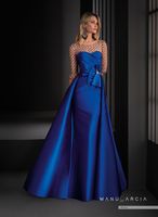 Deja a todos los invitados boquiabiertos con este vestido de fiesta. Si el color azul en mikado de seda no fuese lo suficiente espectacular, le sumamos el escote semitransparente en tul nude bordado con un cuerpo de lorzas asimétricas terminado en la cintura en forma de flor adornada con pedrería, desde donde sale una falda con base sirena y una amplia sobrefalda dando amplitud y cargando este diseño de dinamismo.