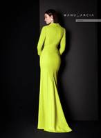 Vestido de fiesta largo y estilo fluido, elaborado en crepe. Presenta un amplio escote en V con cuello smoking de pedrería, la espalda es cerrada y la manga francesa con un puño vuelto también en pedrería. La cintura destaca por el fajín tableado que la adorna, dejando paso a una falda caída y muy femenina.