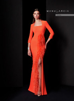 Sofisticado vestido de fiesta largo, de estilo clásico y corte sirena, confeccionado en crepe suave. La falda destaca por su amplia abertura adornada a lo largo con plumas naturales del mismo tono. El cuerpo presenta un escote cuadrado y la espalda cerrada con manga francesa con un bonito trabajo tableado en la bocamanga. La cintura se ciñe gracias a un fajín drapeado del mismo tejido.