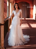 Si eres una novia romántica pero atrevida este es tu vestido, la falda evase de plumeti combina a la perfección con un cuerpo de encaje de estilo bohemio de escote pico. Lleva mangas 3/4 de estilo francés rematadas con puntilla que consiguen un estilo romántico fundiendo las líneas boho chic más dulces.