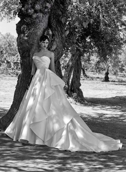 Destacan en estos diseños únicos las sobrefaldas de diferentes volúmenes, confeccionadas en jacquard y piqué de seda, adornadas con amplias lazadas y aplicaciones florales. Una colección diversa de exquisitos tejidos elegantes, encajes con aplicaciones de cristal, tules de brillo y detalles bordados que representan la esencia de la marca.